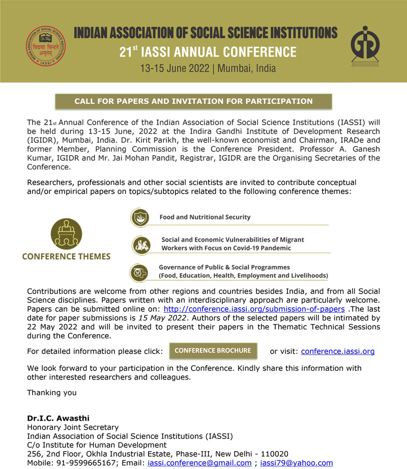 Conference Announcement and Call for Papers: 21st IASSI Annual Conference; 13-15 June 2022; IGIDR, Mumbai, India